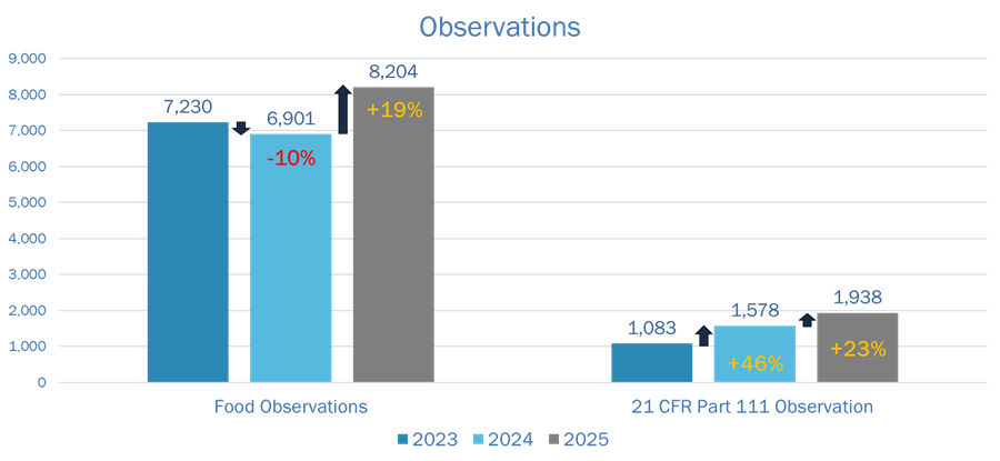 Dietary supplements fall under the Food category, but Part 111 observations are increasing at a faster rate than the overall Food category. This signals increased scrutiny of dietary supplement cGMP and dietary supplement manufacturing compliance systems.